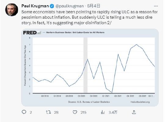 克鲁格曼指出,美国单位劳动力成本(ULC)和未来通胀预期的下降就是证据。他在周日的一条推文中写道:“一些经济学家指出,快速上升的ULC是对通胀持悲观态度的原因。但突然之间,ULC讲述了一个不那么可怕的故事。事实上,它表明了严重的反通胀。”